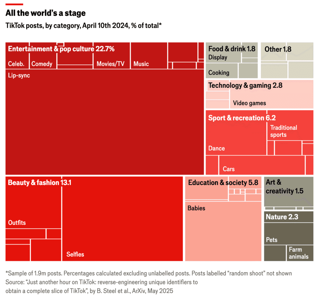 What does an hour on TikTok look like? A study from 2024 attempted to pull and analyze every TikTok on the platform posted for one hour (1.9m posts in total). The results, shown in the study and in the Economist, highlight the topography of the platform – from a mass of pop culture and entertainment through to corners of pet videos, beauty and sports.