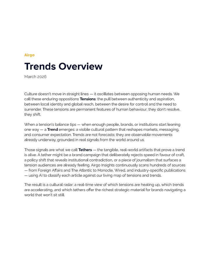 Trend spotting is hard for the best strategists, so my expectations for my current model aren’t high. Reading 100+ rss feeds daily, plus anything I manually share with it, the model uses Gemini + Claude to analyze, tag and cluster trends to wider behavioural tensions.